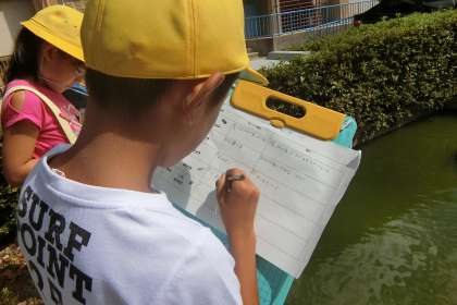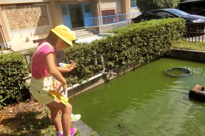 「動物のすみかをしらべよう」では,どんな動物がどうのような場所でどんな様子をしているのか校内をしらべていきました。かめ池では,めだかをみつけて何をしているのか観察しています。