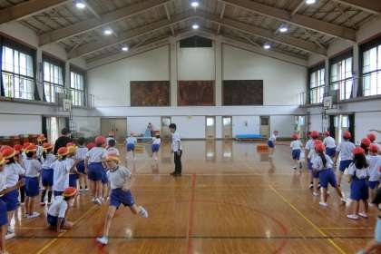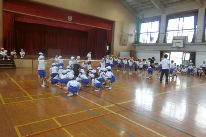 この日の運動会の練習は,雨のため体育館で行いました。初めて実際に競争をしました。とても盛り上がり,どの色も一生懸命友だちを応援する姿がありました。