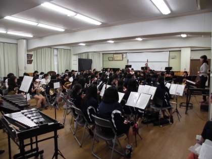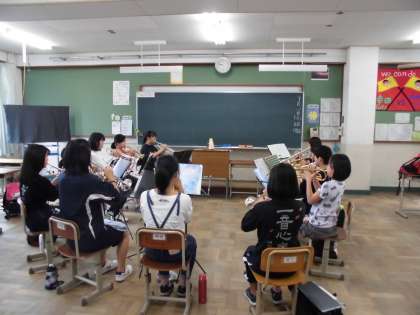 16日の羽束師区民運動会の合同演奏に向けて,羽束師小学校ブラスバンド部と,神川中学校吹奏楽部の合同練習をしました。