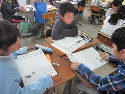 自分の考えをグループで交流しています。