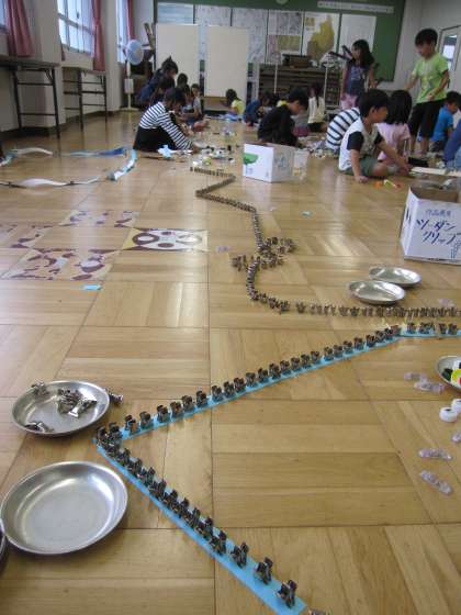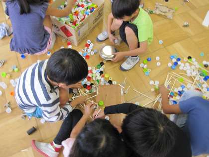 たくさんのいろいろな材料を使って、友達と相談したり協力したりしながら、様々に並べていました。