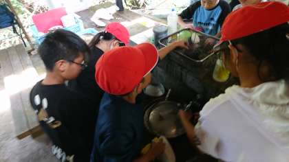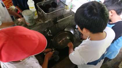 炭がついたお鍋やお皿,使う前よりきれいになるよう,分担しながら洗っています。