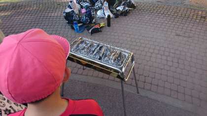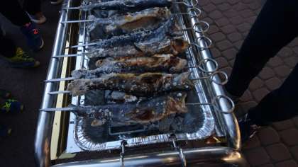 串にさした魚に塩をふってもらい,炭で焼いています。