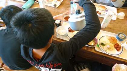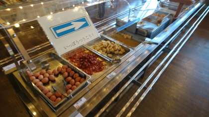 ゆで卵やサラダ,思い思いにとって「いただきます!」