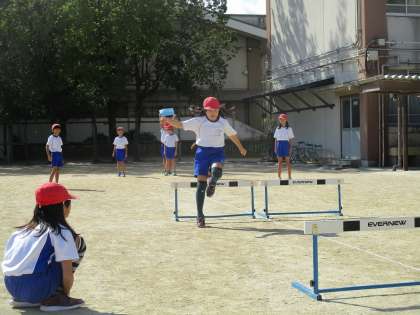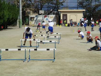 ハードル走の学習は,役割分担がとても大切です。走者の他に,スターター,ハードルを並べる人,計測係と,交代しながら取り組みます。だんだんスムーズになってきて,ハードルのこえ方にこだわることができるようになってきました。少しでもタイムを縮めることを目指します!