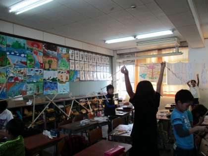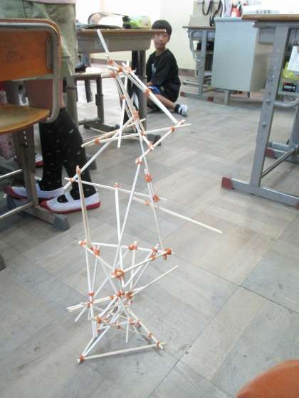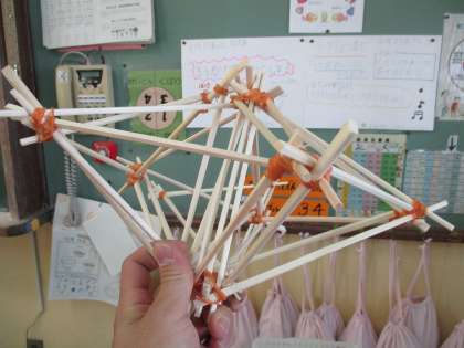 使うものは割りばしと輪ゴムだけ。どんどんつないでいくと,長くなったり,高くなったり。思い思いの形が出来上がっていました。