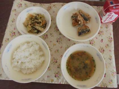 今日の給食では京都府産の「とびうお」「赤みそ」を使用したので,