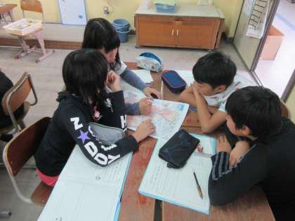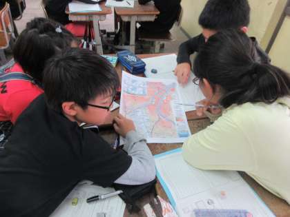 5年生では今,西羽束師川について学習しています。今日は伏見西部のハザードマップを見ながら,羽束師地域が低い土地であることや,大規模水害となった場合には大きな被害が出ることが想定されていることを学びました。班での交流も盛り上がっていました。