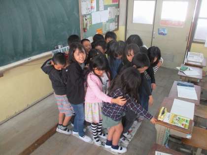 1平方メートルを実感するために用意した新聞紙。「何人乗れるかな」という言葉が子どもたちの心に火をつけたようで,教科書の人数を大きく上回る20人という記録が出ました。「先生,まだすきまある!」あくなき向上心に感服です。