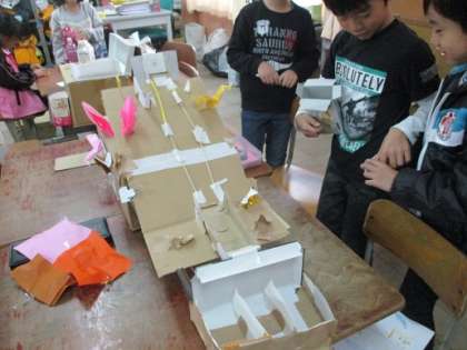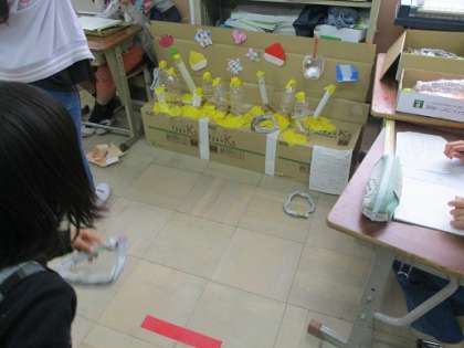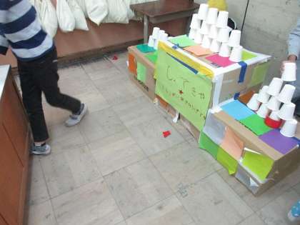 2年生の「あそびランド」をやりました。自分たちが作った遊びを違うクラスの友達に遊んでもらいました。いつもは作ってばかりですが,他の人に遊んでもらうことで新しい発見がありました。1年生を招待する前に,もっと楽しい遊びになるようにこれから改良していきます。