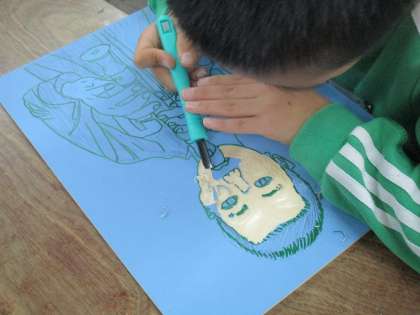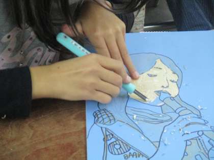 板への転写も終わり,いよいよ彫刻刀を使った「彫り」に取り組みます。久しぶりの彫刻刀に,慣れない手つきも見られましたが,時間が終わるころにはすっかり感覚が戻ってきた様子でした。「もう終わり?」という声が上がるほど集中した,あっという間の学習でした。