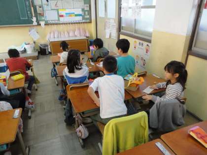 お互いに作った作品を見合って、相手の作品の良いところを鑑賞カードに書いて、相手に渡します。「この箱すごい。」「もっと書きたい。」と鑑賞を楽しんでいました。