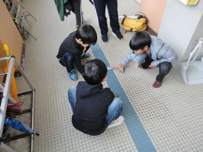 放課後、友達が廊下にお茶をこぼしてしまった時、「ぼくが拭いてあげようか。」と近くにいたみんなで力を合わせて雑巾で拭いてあげます。