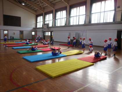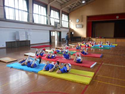 マット運動では,まず猫ちゃん体操でからだならしをします。