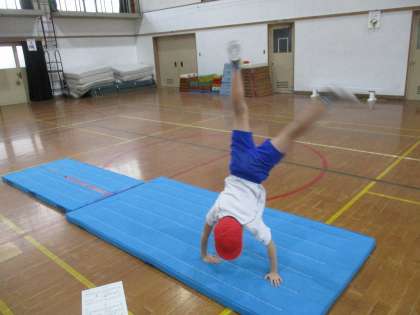 できる技を組み合わせて,一続きの技を練習しています。ストレッチをしっかりして,どんどん取り組んでいました。