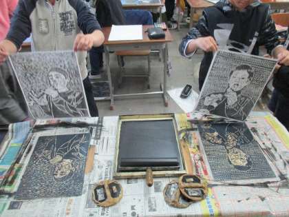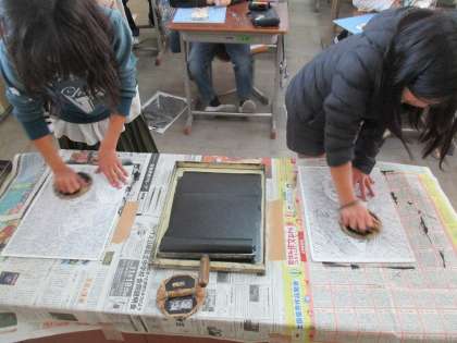 彫り終わったところで,いよいよインクをつけて「刷り」の工程に入りました。インクが付いただけで,一気に板の様子も変わります。慎重に紙を置いて,力を込めてバレンでこすって,刷りあがりとドキドキの対面。絵画とは違う味が,とてもよいですね。