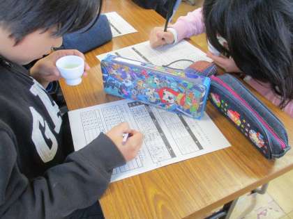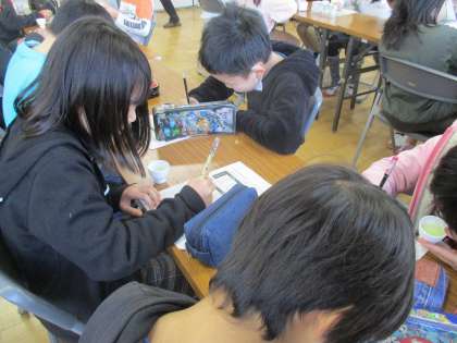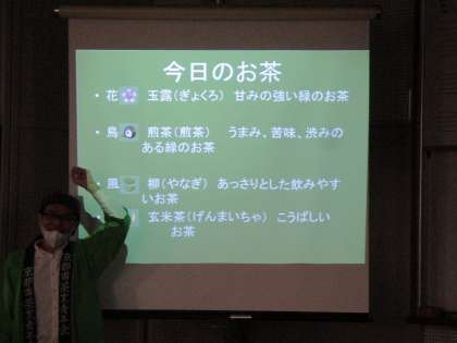京都市茶業青年会の皆さんをゲストティーチャーにお招きして,「茶香服体験」をしました。花鳥風月の名前が付けられた4種類のお茶を,色味や香りをたよりに当てるというものです。最初は「全部苦い!」と言っていたのですが,次第に違いに敏感になり,全問正解の人もいるほど,真剣に取り組んでいました。最後に淹れていただいた「玉露」は,そのまろやかさ,甘みの衝撃に大歓声が上がっていました。