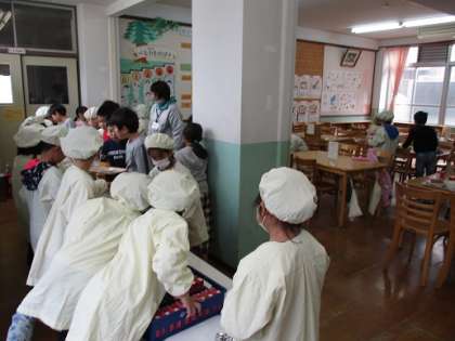 2年生のランチルームでした。教室とは違う雰囲気です。みんなで協力して準備をしておいしく給食をいただきました。