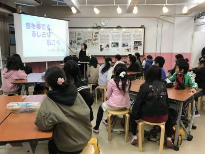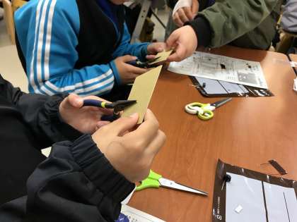 ラジオペンチやホチキスを使って,「音を奏でるふしぎな石ころ」を作りました。石ころ=セラミックスが身近な電子機器にたくさん使われていることを知り,「モノづくり」に挑戦しました。光を当てると音が流れる仕組みに,歓声が上がっていました。