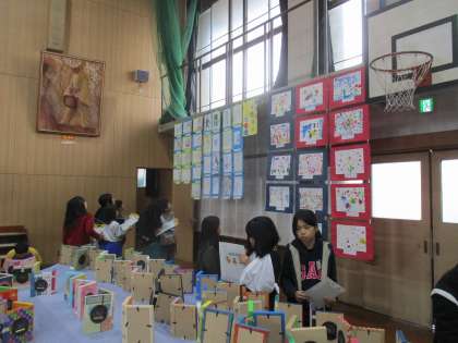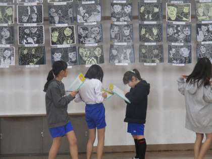 「6年生,かっこいいなあ!」「3年生の版画もアイデアがすごいね。」他の学年の作品をまじまじと見る姿が体育館中にありました。これからの自分たちの創作活動につながるといいですね。
