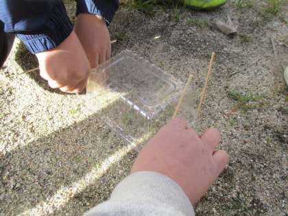 「土にしみこんでいたら,土からも蒸発しているはずだ。」イチゴパックを伏せてしばらく置いておくと,水滴が付きました。水たまりの行方が,二つの実験で明らかになりましたね。