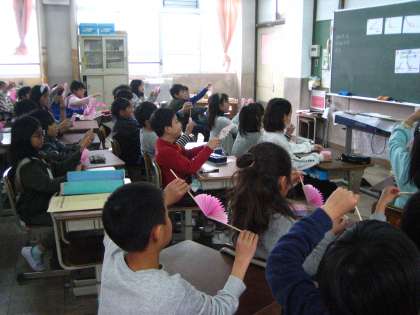 4年生「角の大きさ」の授業です。ピンク色の部分が,「角の大きさ」になるのでわかりやすいですね。