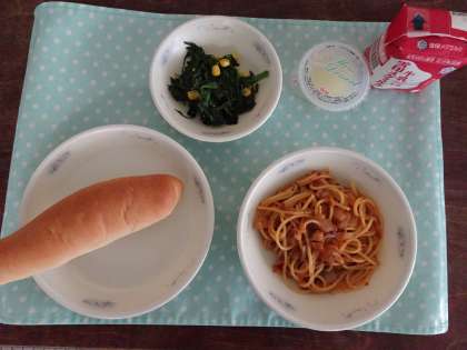 今日の献立は小型コッペパン・牛乳・スパゲティのミートソース煮・ほうれん草のソテー・りんごゼリーです。
