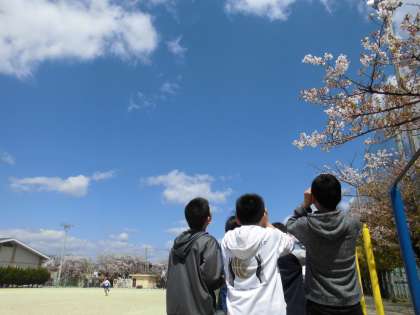 理科の学習で,雲の動きをみています。天気もよく,桜も咲いていてよかったです。