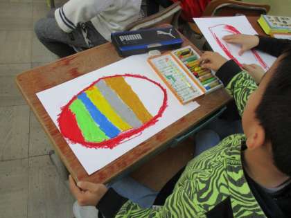 たまごからどんなものが生まれてくるだろうとイメージを膨らませて,オリジナルの世界を描きました。カラフルなたまごから動物や車,宇宙など個性あふれるものがたくさん飛び出していました。