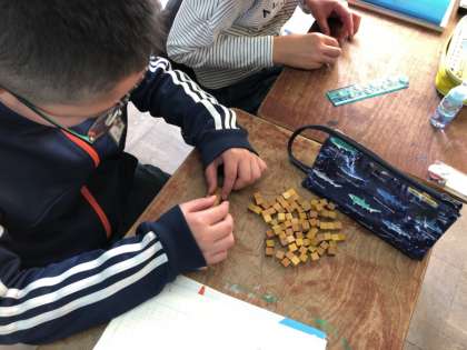 積み木遊びにも見えますが,量感をつかむための大切な学習です。