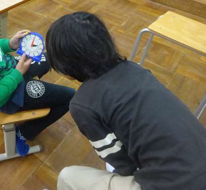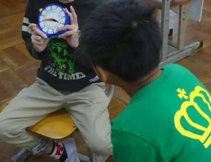 今日も算数科で時計の学習をしました。今日は実際に時計を持って「何時でしょうクイズ」を出し合いました。「何時でしょう。」「3時かな。」「何時でしょう。」「11時だよ。」など,学んだことをもとに活き活きと活動する姿が印象的でした。クイズの後,改めてプリントで反復練習をしました。たくさんクイズを出し合った成果もあり,全問正解でした。
