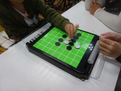 今日はひまわり学級の1年生児童と給食を一緒に食べた後,昼休みにボードゲームをして遊びました。ボードゲームは,1年生児童の好きなオセロ。1年生児童と5年生児童が対局しました。手に汗握る展開に,まわりで見ていた児童も「がんばって。」と応援する姿がありました。結果は対局の途中で昼休みが終わってしまい,引き分けでしたが,両児童ともうれしそうな表情をしていたのが印象に残っています。「またやろうね。」と約束をしたので,また近いうちに熱戦が見られるかもしれません。