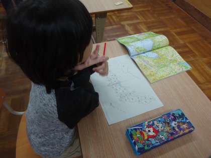 社会科で大阪府について学習しました。地図帳を開いて大阪府の場所を確認します。「京都のとなりにあるね。」「京都に比べて小さいね。」など,地図を見ながら気づきの言葉をたくさん発表してくれました。学習後のふりかえりでは「大阪はたこやきが有名なんだね。」「たこやきの他にもたくさんの食べ物やテーマパークがあるんだね。」「大阪に行ってみたいな。」など,たくさんの声を聞くことができました。
