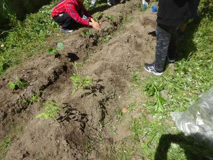 総合的な学習の時間に,野菜の苗を植えました。「トマト」「キュウリ」など,自分たちで育てようと思って選んだ野菜です。「水やりをがんばるぞ。」「大きく育ちますように。」など,児童の意欲的な姿が印象的でした。
