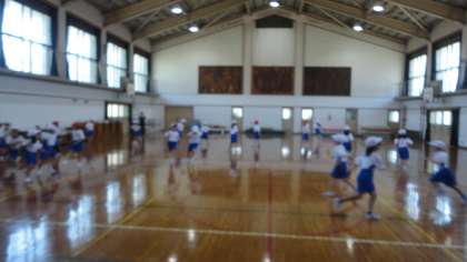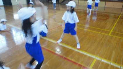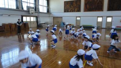 体育では全身を使ったじゃんけんなど,からだを動かして元気いっぱいに,からだほぐしを楽しんでいます。