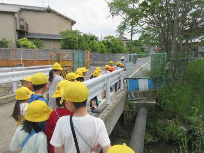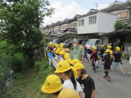 今回は羽束師小学校よりも東側のコースです。西側コースに比べて田んぼが少なく,住宅街が続き,子どもたちはみんな「あそこは○○さんの家や!」とか「ここの公園の遊具楽しいで!」などと,楽しそうに話していました。