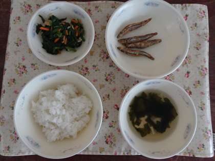 今日の献立は、ごはん・きびなごのこはくあげ・ほうれん草の煮びたし・若竹汁です。