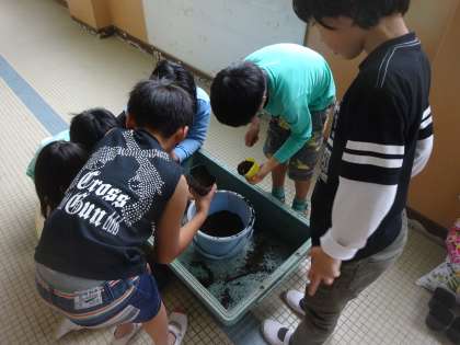 総合的な学習の時間で,種から野菜をつくる活動が始まりました。事前に育てる野菜の種を観察し,色や形など気づいたことを交流しました。その後,ポットに土を入れて,種をまきました。学習後のふりかえりでは「大きく育ってほしいです。」「野菜によって種の形が違うことがわかりました。」など,たくさんの言葉を聞くことができました。