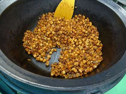たらと豆のアングレスは,ミックスビーンズとたらをそれぞれ揚げて,ウスターソース・ケチャップ・砂糖で作ったタレをからめたものです。