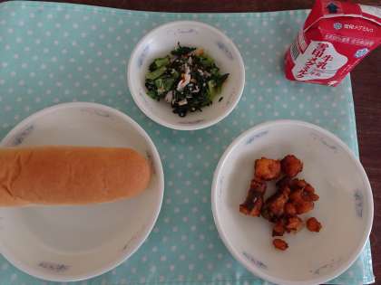 今日の献立は,コッペパン・牛乳・たらと豆のアングレス・小松菜のソテーです。