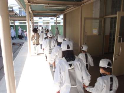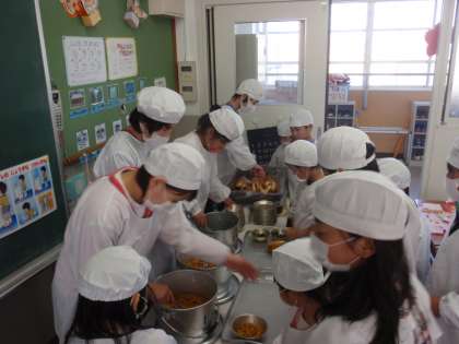エプロンの着方,おかずの入れ方,配り方など1年生に教えてあげていました。