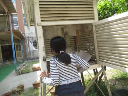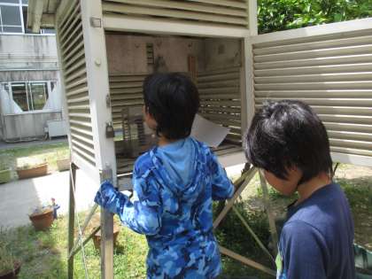 理科で天気と気温の学習をしています。百葉箱を使って1日の気温を確かめました。1時間ごとに気温を記録しました。正午から午後2時ごろの間が1番気温が高くなるということに気がついていました。