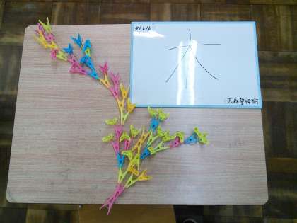 図工の学習で,せんたくばさみを使って,つなぎ方を工夫して作品を作りました。4色のせんたくばさみ200個を目の前にして「あれ作ろう!」と何やらつなぎ合わせて作っていきます。平面ばかりでなく,つなぎ方を工夫すると立体作品にもなり,楽しんで活動することができました。でき上がった作品はカメラで写真におさめます。カメラのアングルもこだわり,迫力のある作品集ができ上がりました。