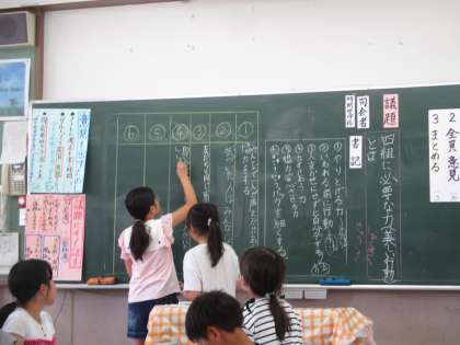 国語「よりよい話合いをしよう」の学習です。議題を決めた後,グループに分かれて話合いをしました。司会・時間管理係・書記と役割も決めて進めました。意見がたくさんでて,決まったことを全体で確認しあいました。