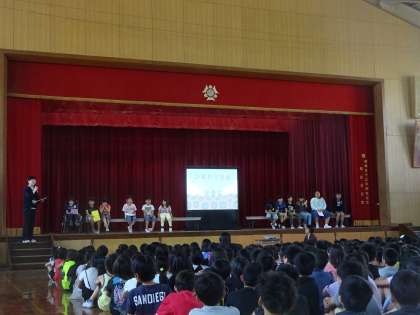 羽束師小学校の全校児童を前に,ひまわり学級の発表会がありました。自己紹介と,ABCの歌を歌いました。全員大きな声で発表することができました。1人1人が発表するたびに,全校児童からは大きな温かい拍手が聞こえました。発表会後には「緊張したけど上手に発表できたよ。」「みんなが拍手してくれてうれしかった。」など,達成感に満ちたふりかえりを聞くことができました。