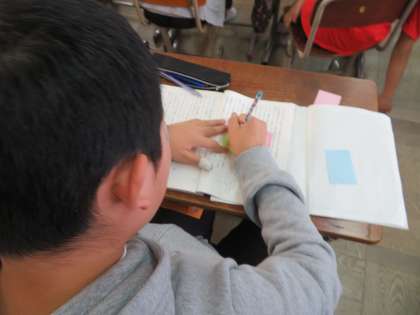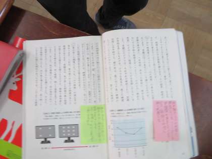 筆者の主張を確認し,自分の体験や自分の考えを付箋にメモしています。