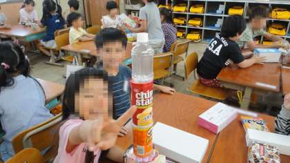 円柱の形の箱では,「横なら転がるなぁ。立ててみると上にまだ積めるよ!」と気付きがありました。