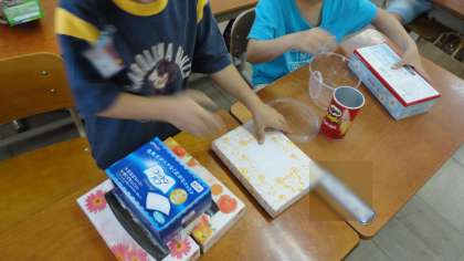 ご家庭で集めて頂いたいろいろなかたちの箱を使用し,積んだり並べたりしながら,円柱型の箱や立方体の箱の形を生かして,お城や車などを作りました。