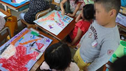 友達の色の塗り方や紙の形の見立て方を褒め合う姿が見られました。