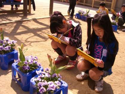 そして、みつけたよカードに、パンジーとチューリップの観察をしています。
